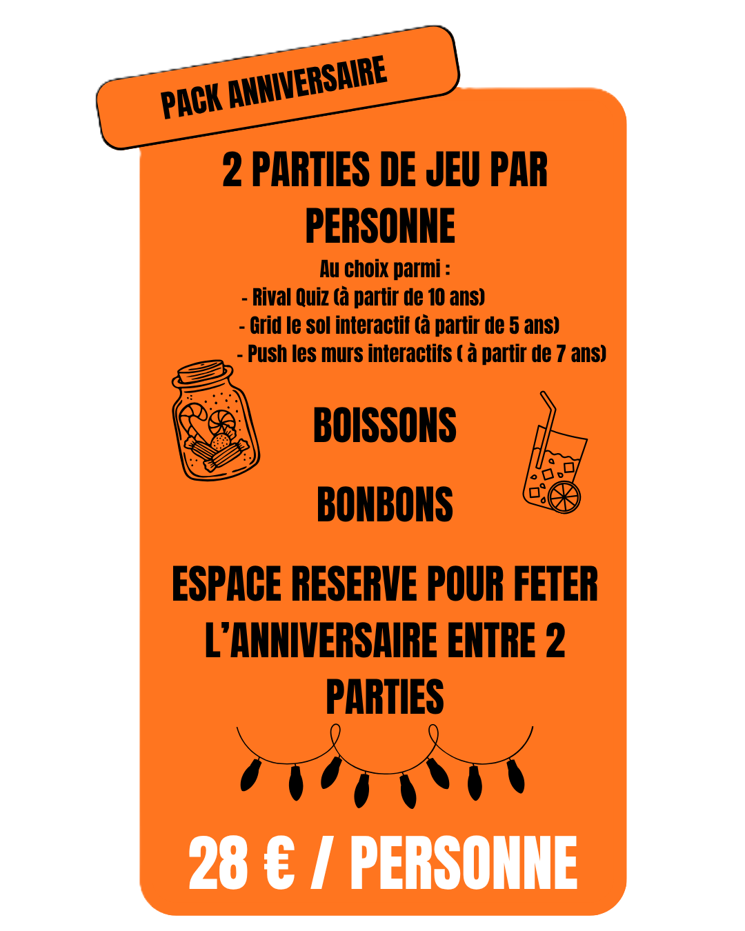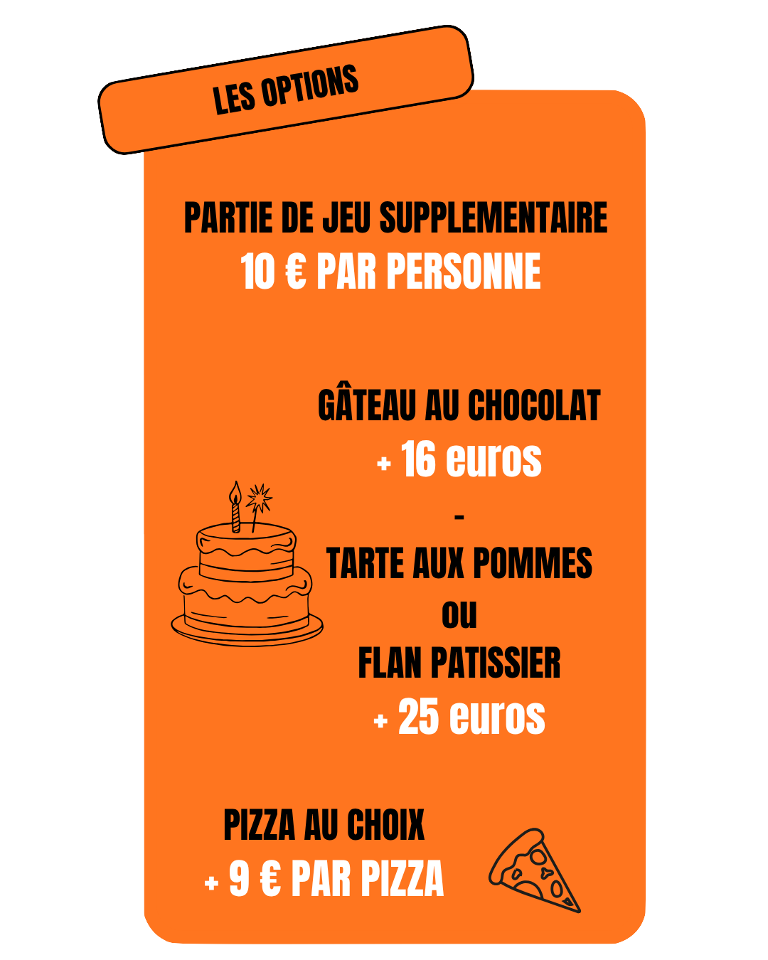 Jusqu’à 35 joueurs en simultané sur nos 4 salles. Réservez une ou plusieurs tables de notre espace bar pour souffler les bougies et échanger les cadeaux. Profitez de nos cartes d’invitation 100% fun et offertes pour toutes réservations de packs anniversaire.